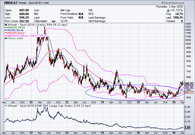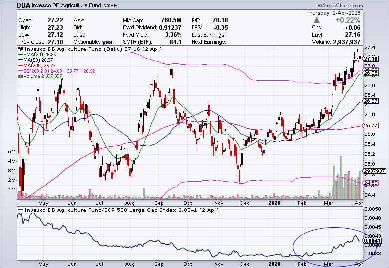 That is an ETF that holds agriculture commodity futures contracts, and it broke out of a stage one base after the war began, and is now outperforming the S&P 500.