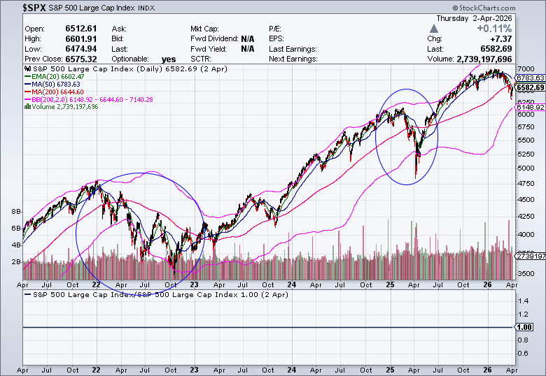 The S&P 500 has fallen below those key moving averages and is now either in some sort of correction, as occurred last year in April, or bear market as happened in 2022.